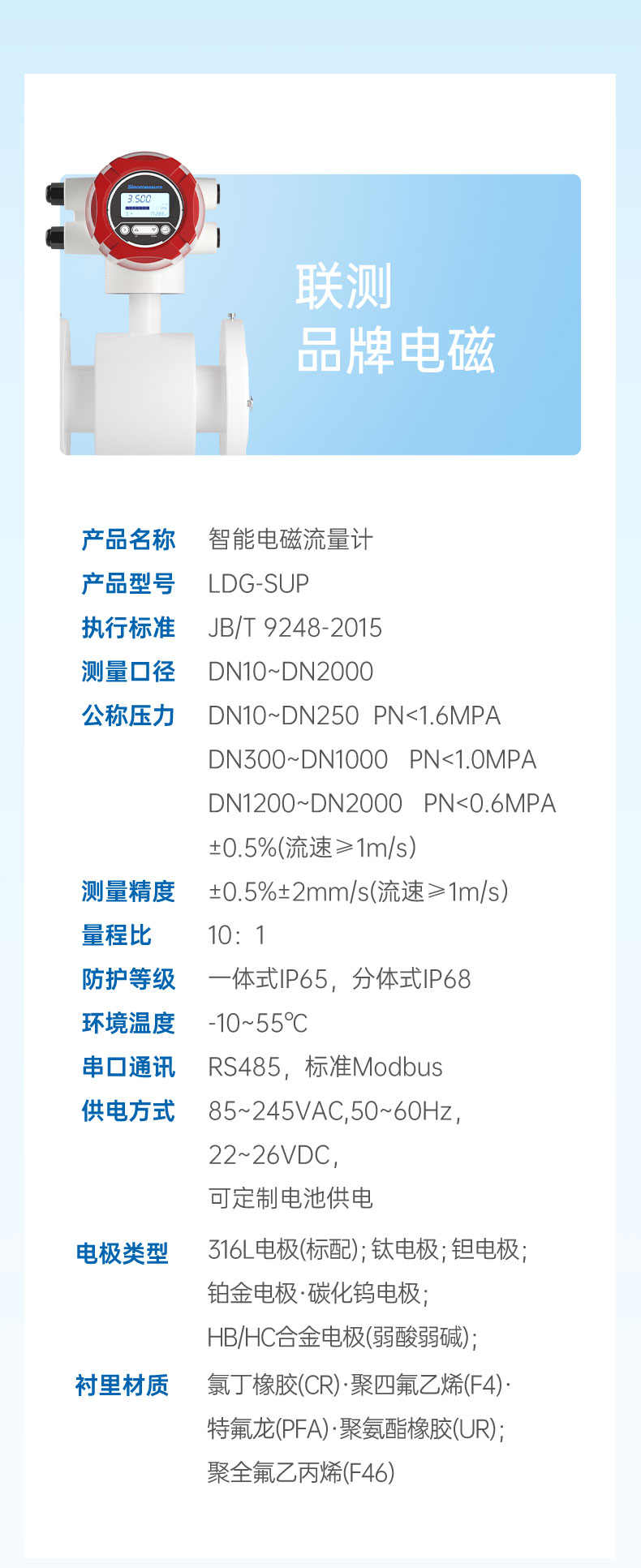 產(chǎn)品描述:聯(lián)測LDG電磁流量計適用于化工助劑、海綿城市、給水排水、水利灌溉、水處理、污水處理(環(huán)保污水控制、化工污水、電鍍污水)、造紙漿液(紙漿)、泥漿、醫(yī)藥原料、食品等工農(nóng)業(yè)的生產(chǎn)公司過程流量測量和控制,標配485通訊功能。