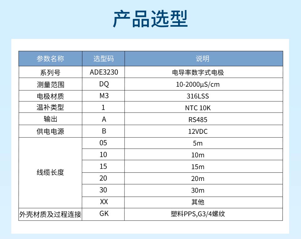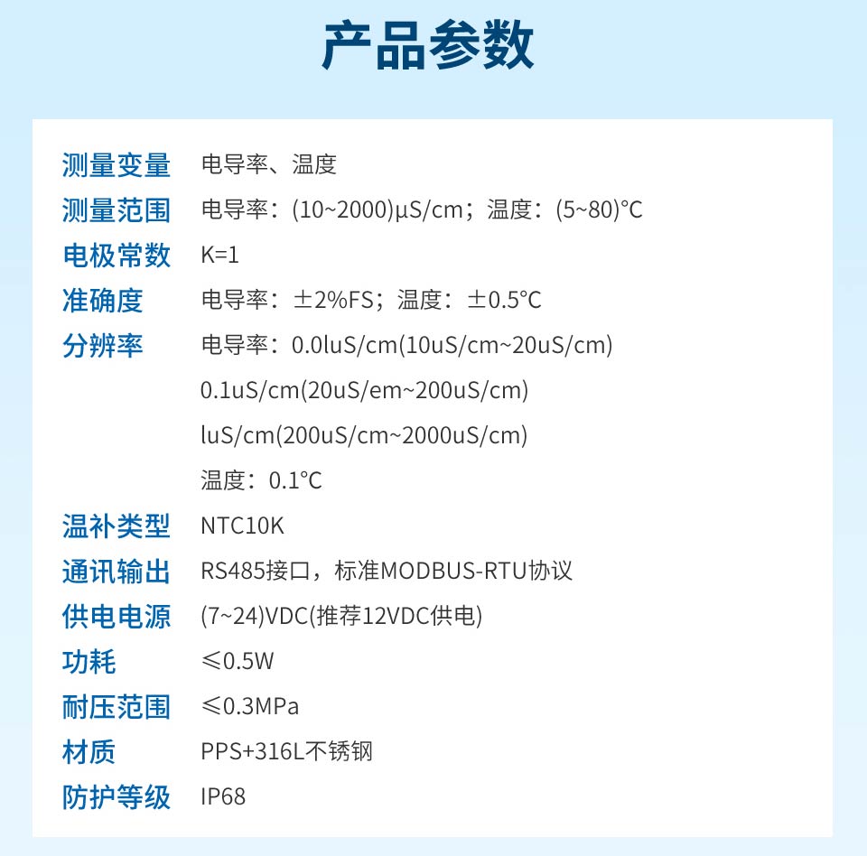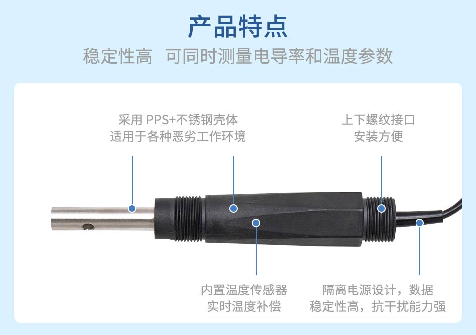產(chǎn)品描述:電導(dǎo)率數(shù)字式電極采用 RS485 通訊接口和 Modbus RTU標(biāo)準(zhǔn)協(xié)議的數(shù)字式電導(dǎo)率傳感器,可同時(shí)測(cè)量電導(dǎo)率和溫度參數(shù)。本產(chǎn)品廣泛應(yīng)用于生活用水、生活污水、江河湖泊、自來(lái)水、市政污水、地表水、循環(huán)冷卻水、軟化水、二次供水、泳池等場(chǎng)合水質(zhì)監(jiān)測(cè)。