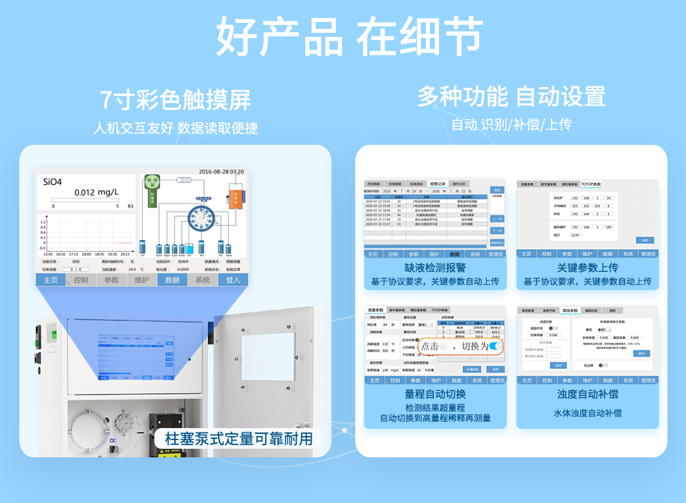 產(chǎn)品名稱(chēng):硅酸鹽在線水質(zhì)分析試劑消耗量小、缺液檢測(cè)報(bào)警、廢液廢水分離