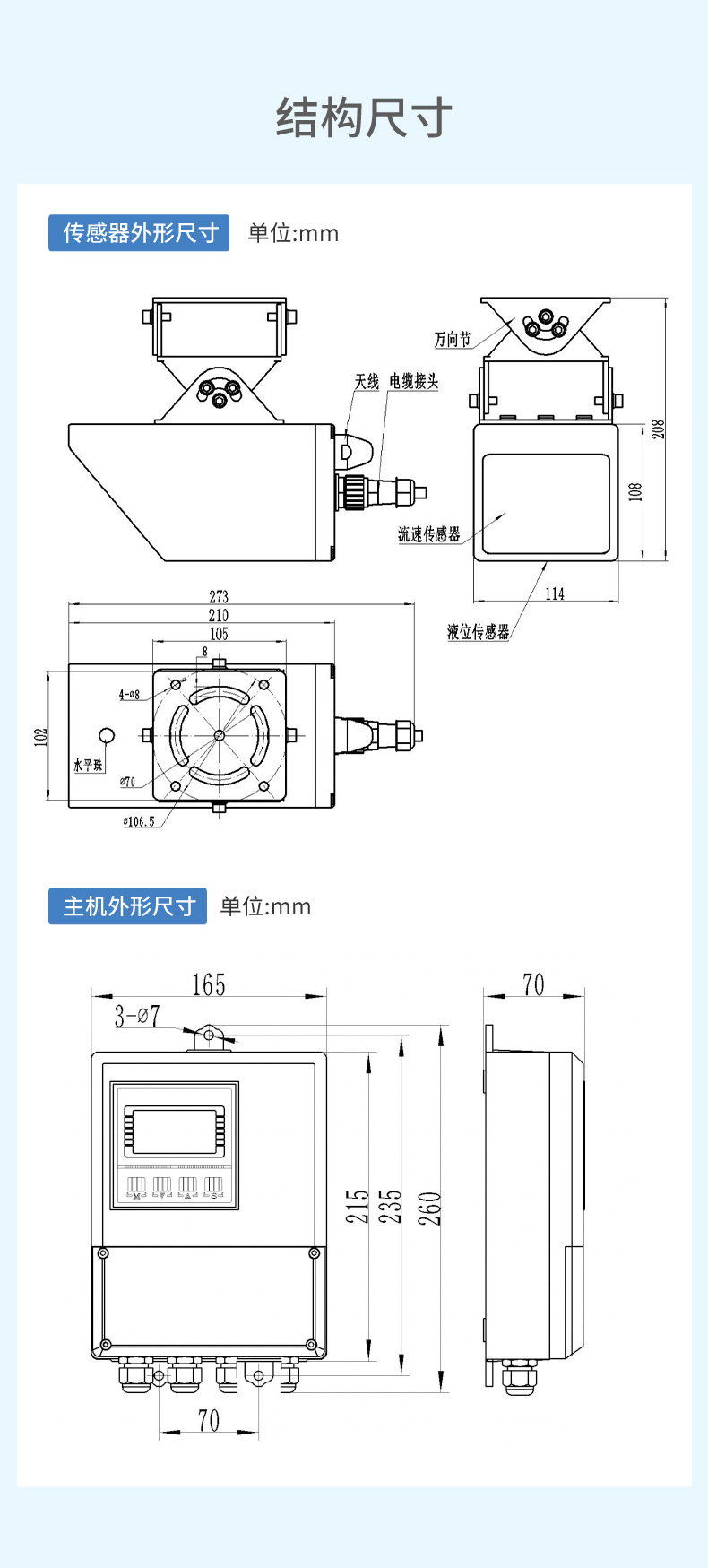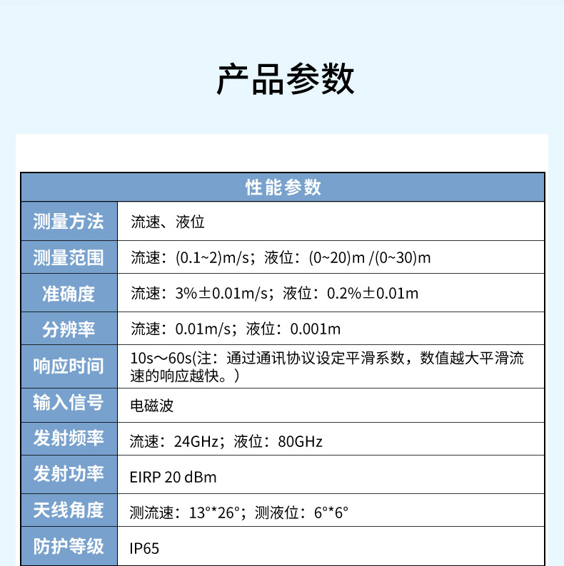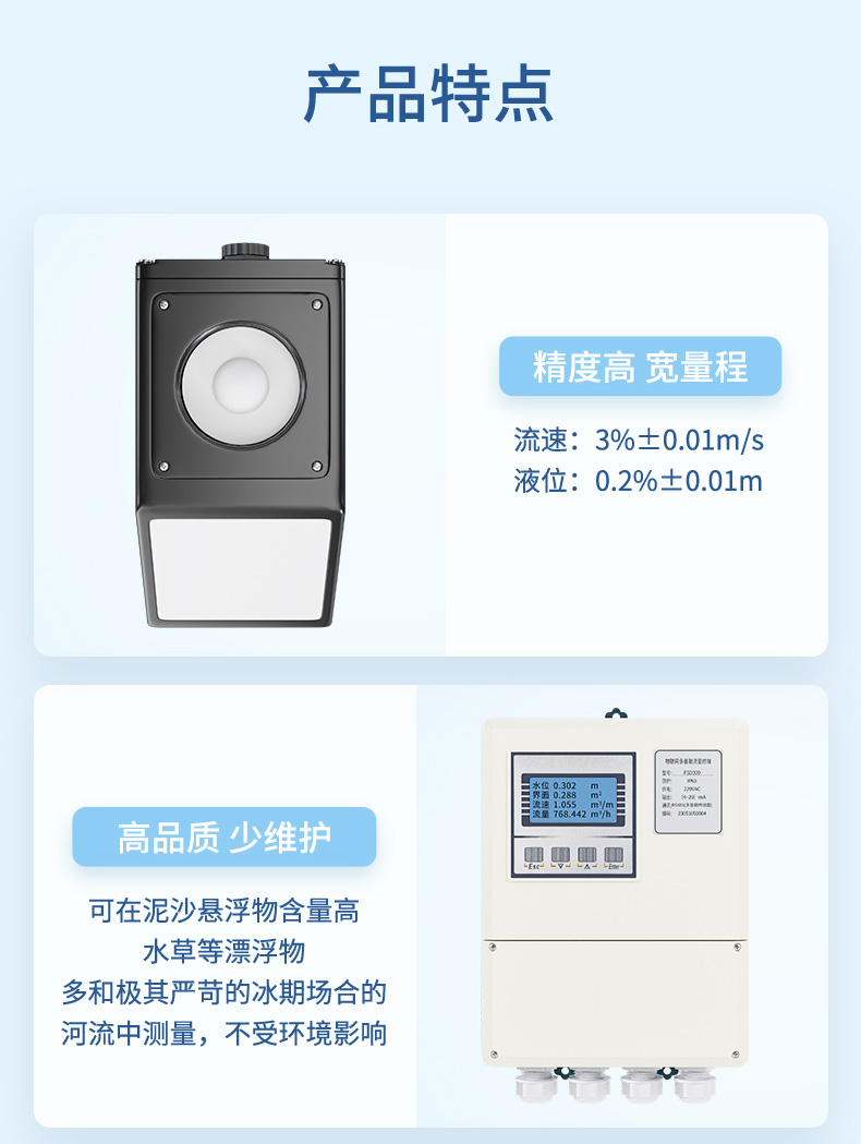 產品描述:本款雷達多普勒流量計是在自然水域中測量水的流速、水位的儀表。測距雷達單元工作頻率為 80GHz,測速雷達單元工作頻率為 24GHz。測量點在機體前方,不破壞流場,適用于泥沙懸浮物含量高、水草等漂浮物多和極其嚴苛的冰期場合的河流中測量??蓮V泛適用于水位測站灌溉支渠、污雨水管網等流量監測。-CN1