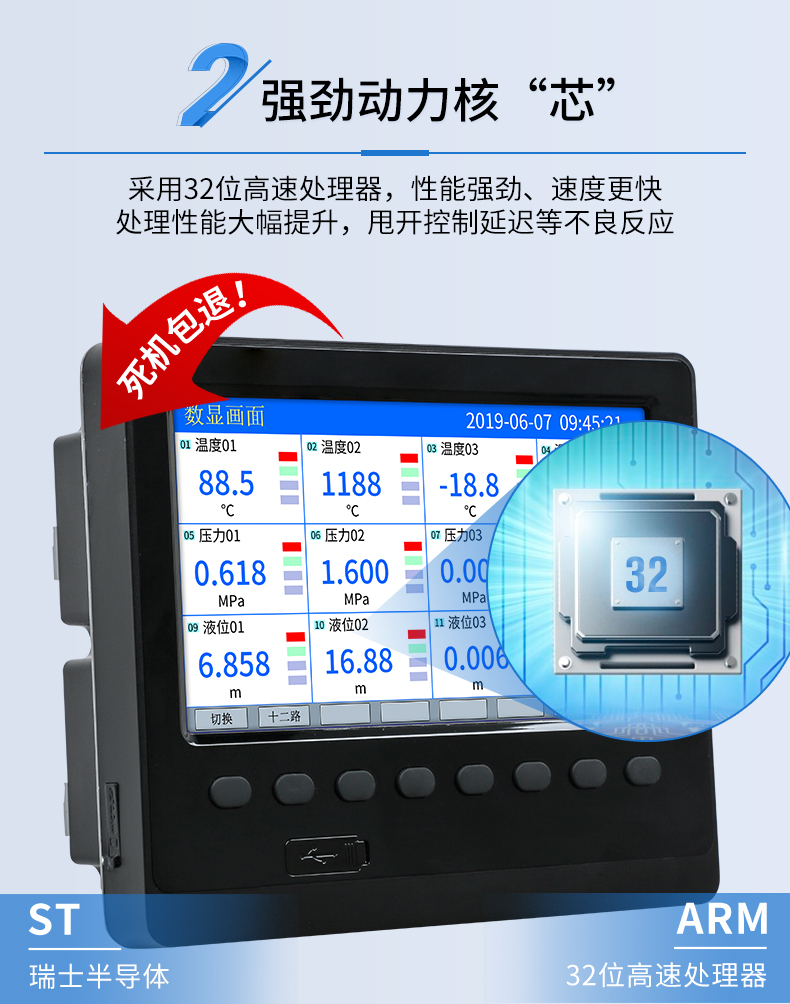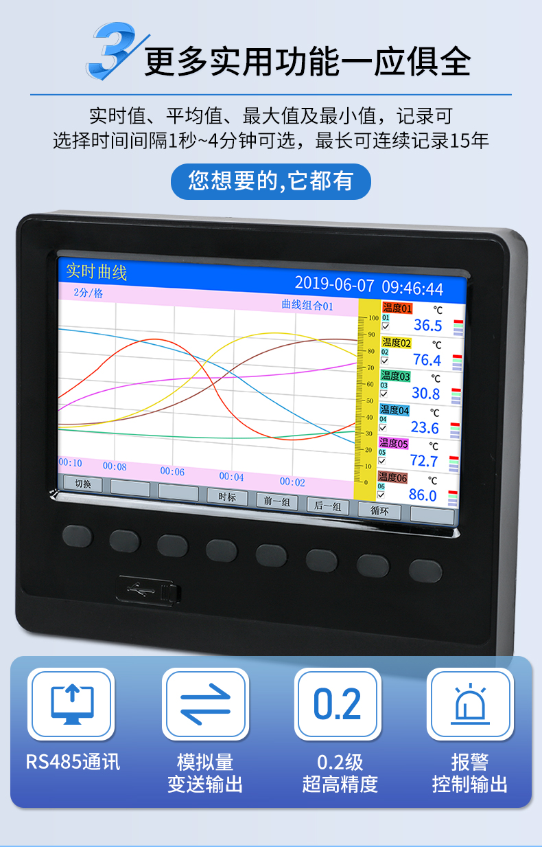 產品描述:工業無紙記錄儀,6 通道萬能輸入,160*80 面板尺寸??奢斎腚娏?、電壓、熱電偶、熱電阻和頻率等工業信號,以數值、棒和曲線形式實時顯示數據,定時將數據存儲于儀表內部電子存儲器,可通過 USB 設備快速轉存歷史數據。
