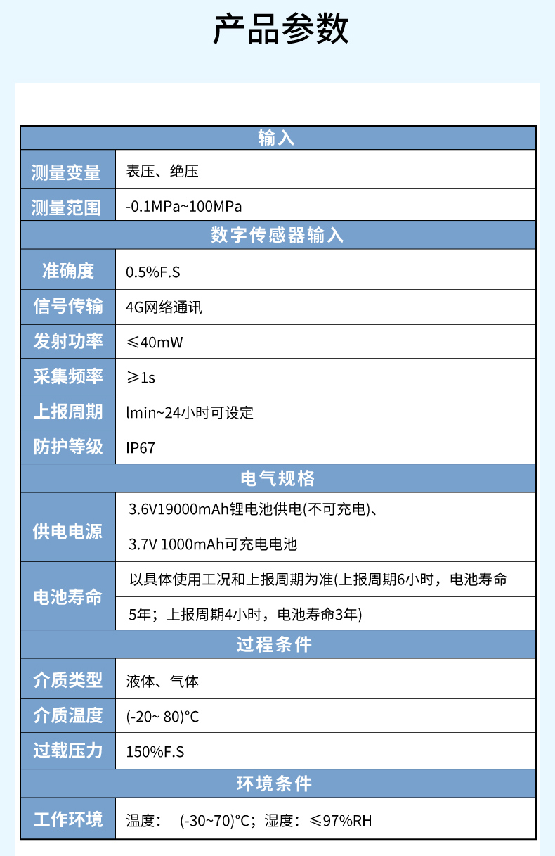 產品名稱: PM800無線壓力傳感器 4G通訊 電池供電 耐壓100MPA 0.5%精度