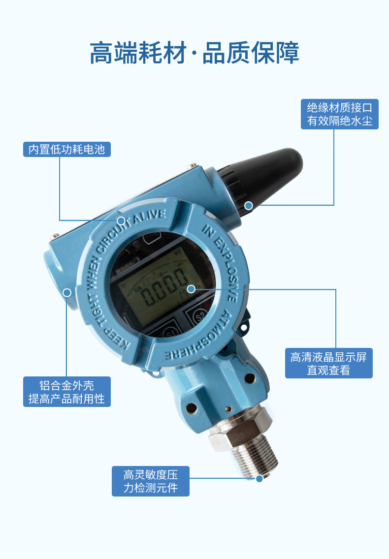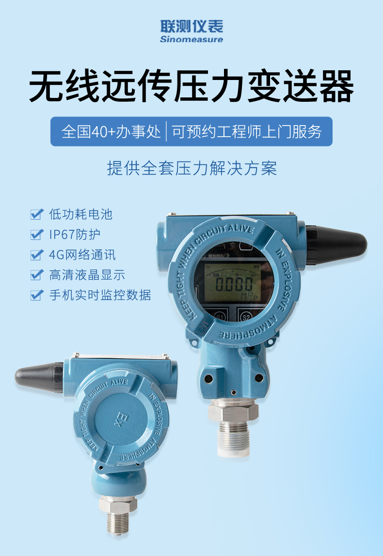 產品描述: 無線壓力變送器是基于 4G 無線通訊網絡使壓力的測量、變送、上報為一體的低功耗智能儀表。產品集成高靈敏度壓力檢測元件,高精度信號調理電路,低功耗電池電源管理,豐富的 LCD 顯示界面于一體,周期性上報壓力測量值、電池電量、信號質量等數據,并且能夠在壓力超出設置范圍時及時報警,提前預警故障隱患。