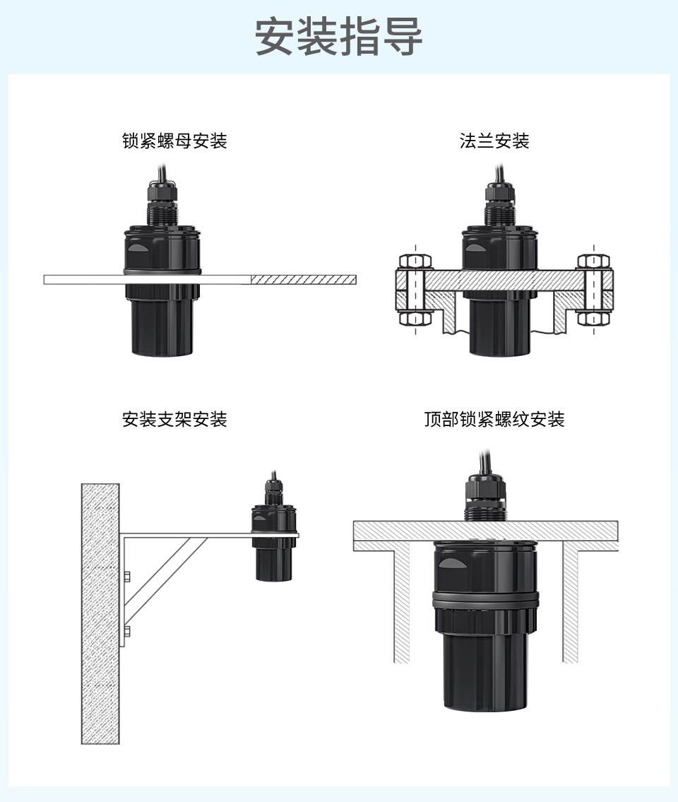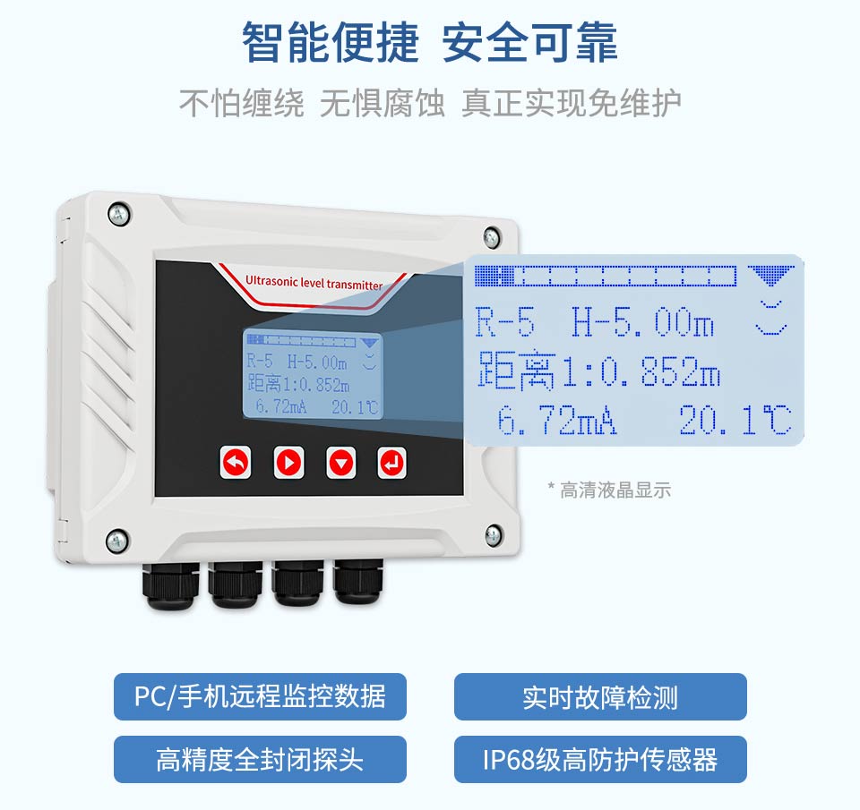 產(chǎn)品描述:本超聲波液位計(jì)是我司研制的一款高集成度的液位/物位測量儀器。探頭采用 PC/ABS 混合材質(zhì)工程塑料外殼,殼體小巧且堅(jiān)固。它具有高可靠、無污染、性能穩(wěn)定、不接觸工業(yè)介質(zhì)就能滿足大部分液位、料位測量要求,解決了壓力式、電容式、浮子式等傳統(tǒng)測量方式帶來的纏繞、堵塞、泄露、介質(zhì)腐蝕、維護(hù)不便等缺點(diǎn)。本產(chǎn)品標(biāo)配藍(lán)牙無線通訊功能,用戶可在微信小程序查看數(shù)據(jù)和遠(yuǎn)程監(jiān)控。常見的應(yīng)用工況,如市政、化工、儲運(yùn)等工業(yè)環(huán)境中的河流、水池、儲罐等液位測量。
